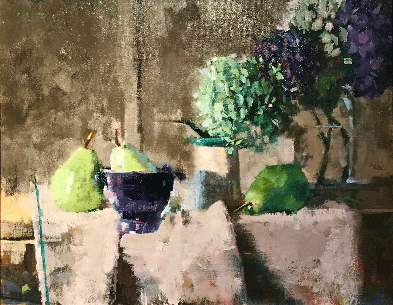 "My paintings are abstract, regardless of their representative nature. Whether setting up a still life, or positioning a figure in a portrait, the objective in the paintings is to create an integrated whole. Conjunction of form is inherent to painting. Conjunction of form refers to many important qualities, i.e. color theme, density of space, overlapping of objects and shadows, paint manipulation (scraping, repainting, scraping again and using a palatte knife to build up areas where texture is desired) and the reworking of borders and edges. I choose still life as an artform, because it allows me to contol all of the above-mentioned elements. Still life in general, is limited in depth and space, therefore, it is a challenge when developing an arrangement to try and capture that multi-layered sense space on the two dimensional surface of the canvas."