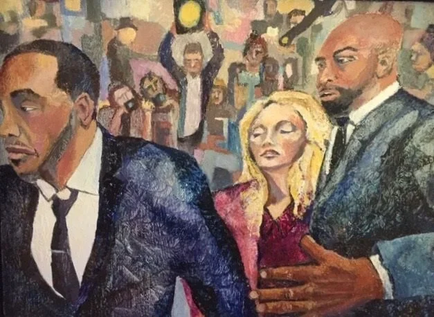 The paintings in this show are part of a series called “Diversities.” Carrington notes that diversity, currently something of a scare-word, is basic to nature, basic to the human psyche, basic to the human family. Artistic expression recognizes this reality, and often aims to capture the particularities of moods, times of day, and variations among people as they age, rage, celebrate or simply wait. In one composition, a late-day golden light briefly graces Virginia’s foothills; in another, Turkish dervishes turn; Kenyan women explode in a celebratory welcome, and black men, long thought to be a threat to white women’s virtue, dutifully protect a blonde porn queen from aggression.